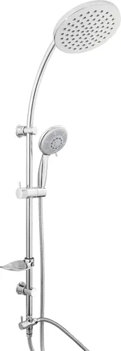 Хромированная стойка Ø 22 из нержавеющей стали, керамический дивертор, мыльница. Регулируемый держатель. Верхний душ STREAM Ø 200. Душевая лейка STORM Ø115 мм, 5 функций. Шланг для душа из нержавеющей стали 150 см.
