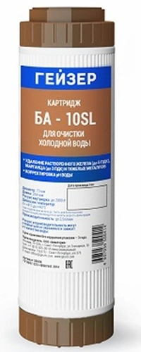 Картридж обезжелезивания ГЕЙЗЕР БА 10" SL ГЕЙЗЕР предназначен для железистой воды, применяется для эффективного удаления избыточного растворенного железа (до 1,5 мг/л) методом каталитического окисления. Фильтрация при помощи природного материала кальцит.