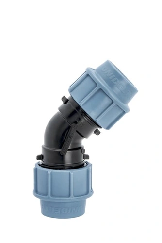 Отвод для ПЭ труб 32х45° UNIDELTA компрессионный фитинг предназначен для соединения труб из полиэтилена низкой плотности, используется для транспортировки питьевой воды и жидкости под давлением, обладает высокой сопротивляемостью к различным химическим веществам, устойчив к УФ излучению.