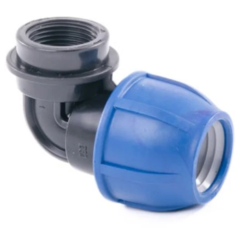 Отвод с внутренней резьбой для ПЭ труб 25x1/2" Lammin является соединительной деталью компрессионного типа из полипропилена для полиэтиленовых напорных труб диаметром от 20 до 63 мм, предназначен для систем водоснабжения и отопления.