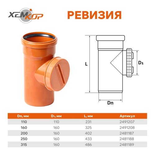 Ревизия ПВХ для наружной канализации Ду 160 ХЕМКОР арт. 2491208 предназначена для проверки работоспособности канализационного трубопровода, а также доступа в канализационную систему для прочистки ПВХ трубы, при ее засорении. Используется для сбора хозяйственно-бытовых и промышленных отходов, а также дождевых сточных вод от зданий и сооружений с дальнейшей доставкой их к сооружениям очистки, либо к месту сбора в водоприёмник.