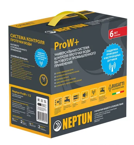 Система 1/2" Neptun Bugatti ProW+ предназначена для своевременного обнаружения и локализации протечек воды в системах водоснабжения и отопления. Система заблокирует подачу воды до устранения причин протечки и проинформирует о возникшей аварии звуковым и световым сигналами.