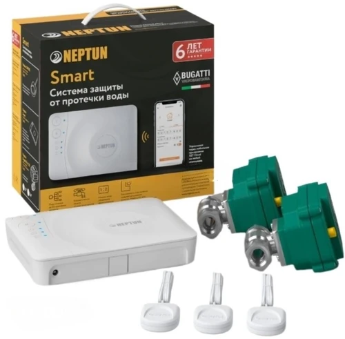 Система 1/2" Bugatti Smart Neptun предназначена для обнаружения и локализации протечек воды в системах водоснабжения. Компоненты системы связаны и взаимодействуют друг с другом через центральный контроллер (модуль управления Neptun Smart).