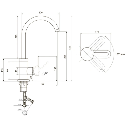 Угол поворота 100°. Гарантия на корпус смесителя 5 лет/комплектующие 2 года.