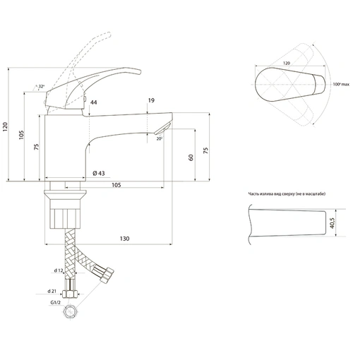 Угол поворота 100°. Гарантия на корпус смесителя 5 лет/комплектующие 2 года.