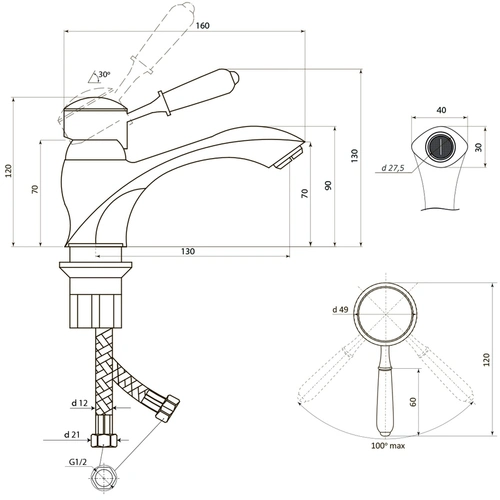 Угол поворота 100°. Гарантия на корпус смесителя 5 лет/комплектующие 2 года.
