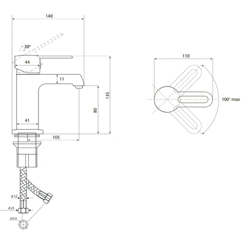 Угол поворота 100°. Гарантия на корпус смесителя 5 лет/комплектующие 2 года.