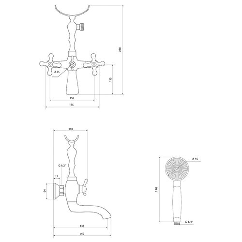 Смеситель, душевая лейка, душевой шланг, держатель настенный для душевой лейки, эксцентрик (пара), декоративный отражатель, (пара), паспорт, гарантийный талон, ключ универсальный.