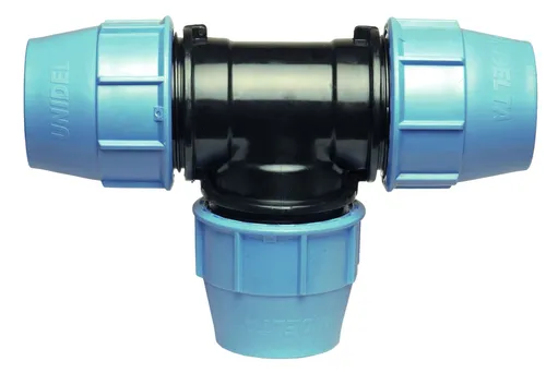 Тройник для ПЭ труб 110 UNIDELTA компрессионный фитинг предназначен для соединения труб из полиэтилена низкой плотности, используется для транспортировки питьевой воды и жидкости под давлением, обладает высокой сопротивляемостью к различным химическим веществам, устойчив к УФ излучению.