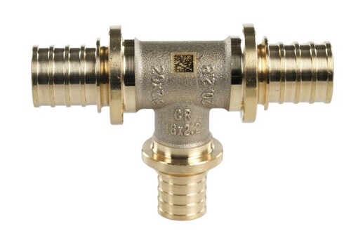 Тройник латунный PE-X переходной Ду 16х20х16 Рехау - аксиальный фитинг, предназначен для разветвления трубопровода с различными диаметрами труб, используется в системах водоснабжения и отопления с трубами из сшитого полиэтилена.