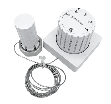 Термостатическая головка (термоголовка) – это чувствительный элемент, который реагирует на температуру воздуха. При нагреве или охлаждении она воздействует на клапан, изменяя поток воды. Бывают модели с выносным датчиком для удобного дистанционного управления.