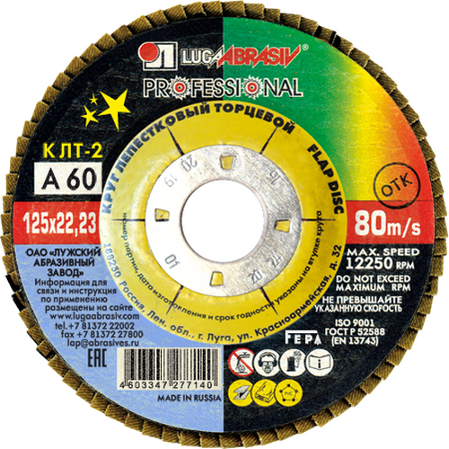 Круг лепестковый 125х22,23 конический А60 КЛТ2 LUGAABRASIV арт. 4603347277140 предназначен для обработки труднодоступных мест, торцевого и плоского шлифования. Коническая форма инструмента при работе, обеспечивает лучшее прилегание лепестков к поверхности металла. Зернистость А60.