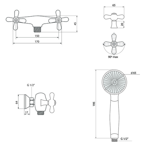 Смеситель, душевая лейка, душевой шланг, держатель настенный для душевой лейки, эксцентрик (пара), декоративный отражатель, (пара), паспорт, гарантийный талон.