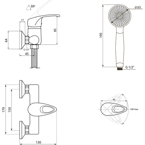 Смеситель, душевая лейка, душевой шланг, держатель настенный для душевой лейки, эксцентрик (пара), декоративный отражатель, (пара), паспорт, гарантийный талон.
