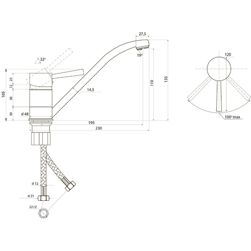 Угол поворота 100°. Гарантия на корпус смесителя 5 лет/комплектующие 2 года.