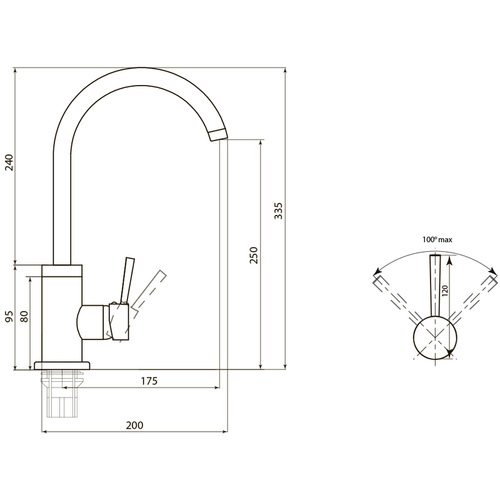 Угол поворота 100°. Гарантия на корпус смесителя 5 лет/комплектующие 2 года.