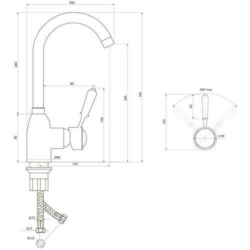 Угол поворота 100°. Гарантия на корпус смесителя 5 лет/комплектующие 2 года.