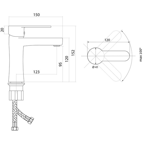 Угол поворота 100°. Гарантия на корпус смесителя 5 лет/комплектующие 2 года.