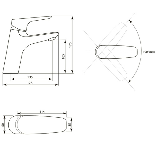 Угол поворота 100°. Гарантия на корпус смесителя 5 лет/комплектующие 2 года.