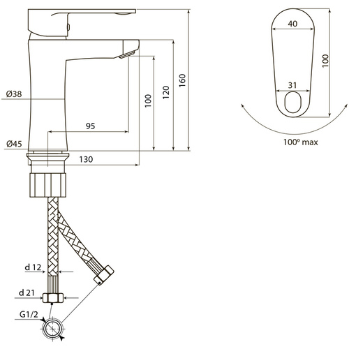 Угол поворота 100°. Гарантия на корпус смесителя 5 лет/комплектующие 2 года.