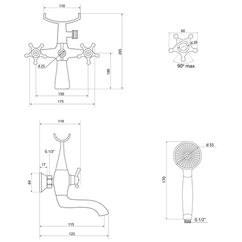 Смеситель, душевая лейка, душевой шланг, держатель настенный для душевой лейки, эксцентрик (пара), декоративный отражатель, (пара), паспорт, гарантийный талон, ключ универсальный.