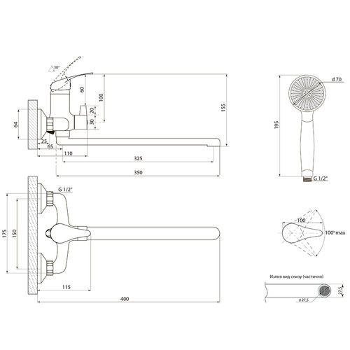 Угол поворота 100°. Гарантия на корпус смесителя 5 лет/комплектующие 2 года.