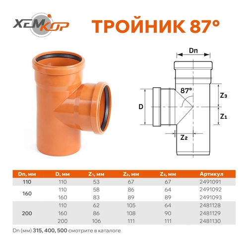 Тройник ПВХ для наружной канализации 87° Ду 160х160 ХЕМКОР используется для устройства разветвлений канализационных трубопроводов при строительстве. Используется для сбора хозяйственно-бытовых и промышленных отходов, а также дождевых сточных вод от зданий и сооружений с дальнейшей доставкой их к сооружениям очистки, либо к месту сбора в водоприёмник.